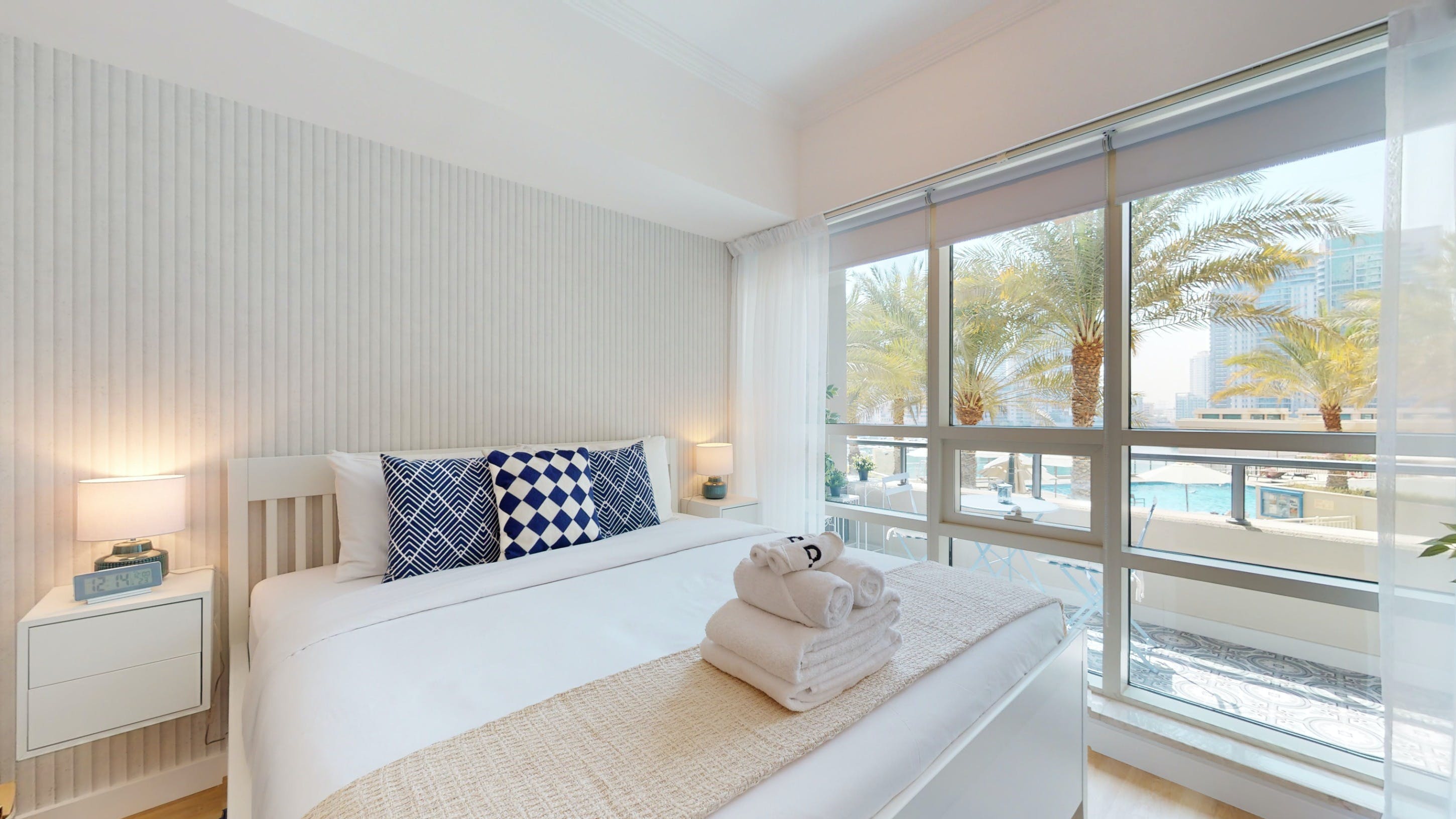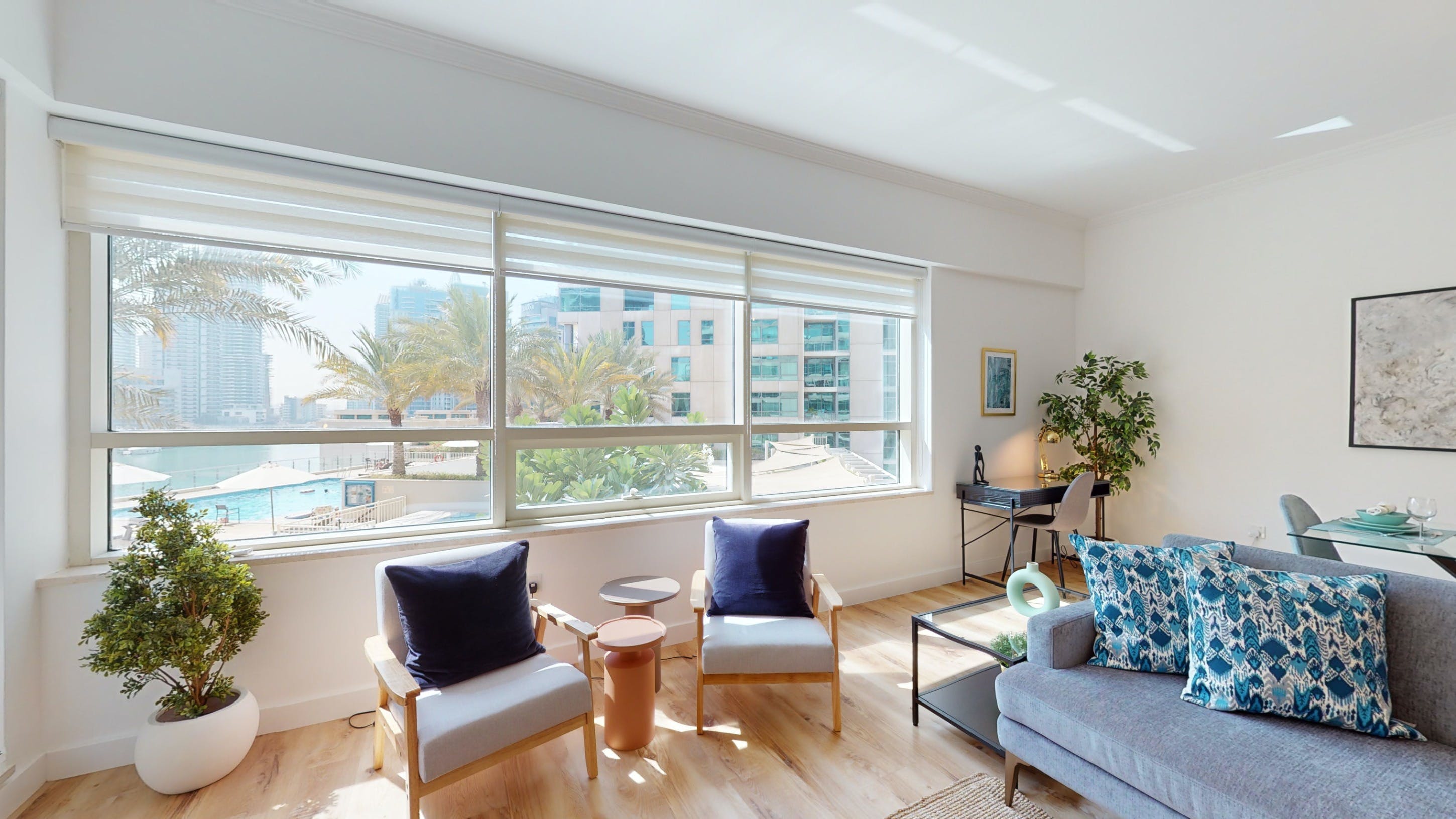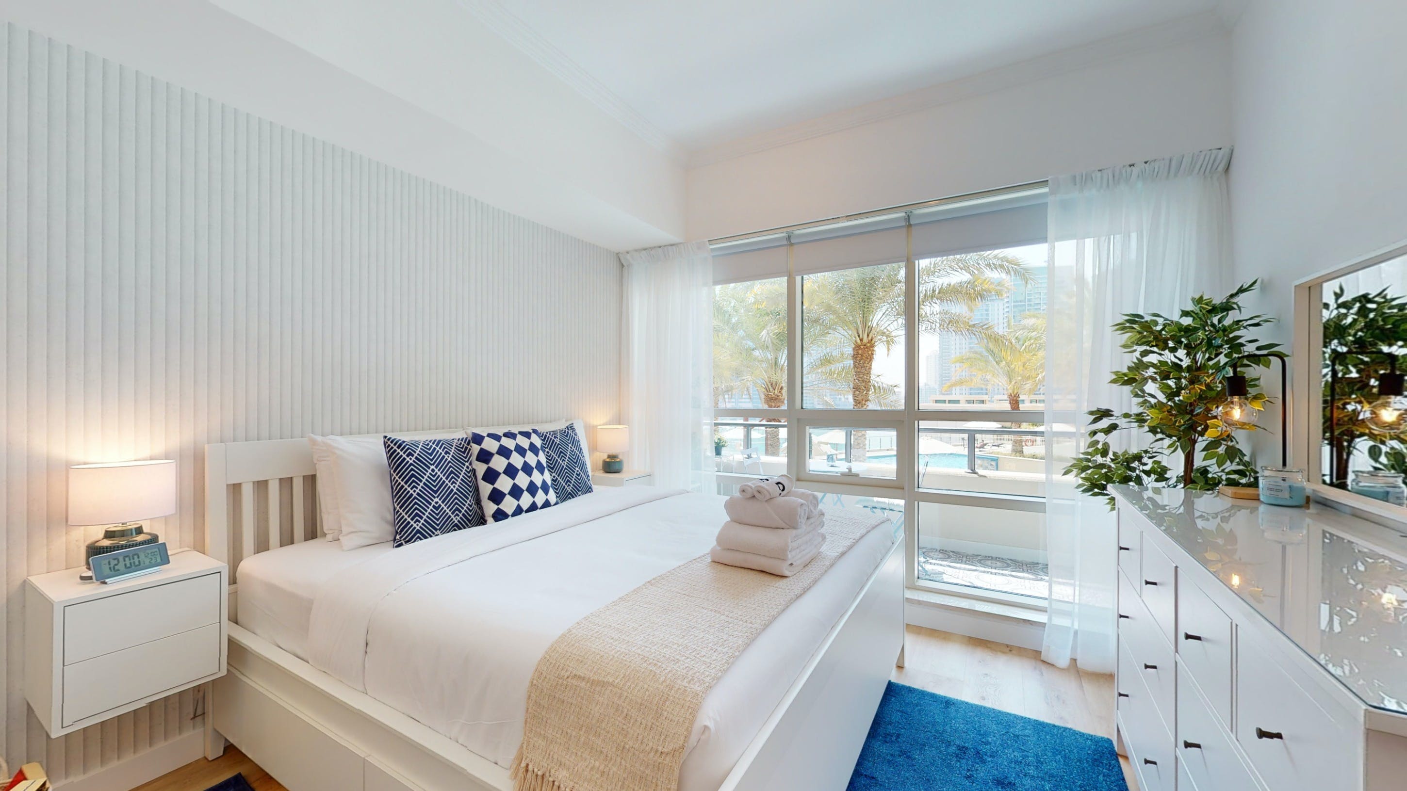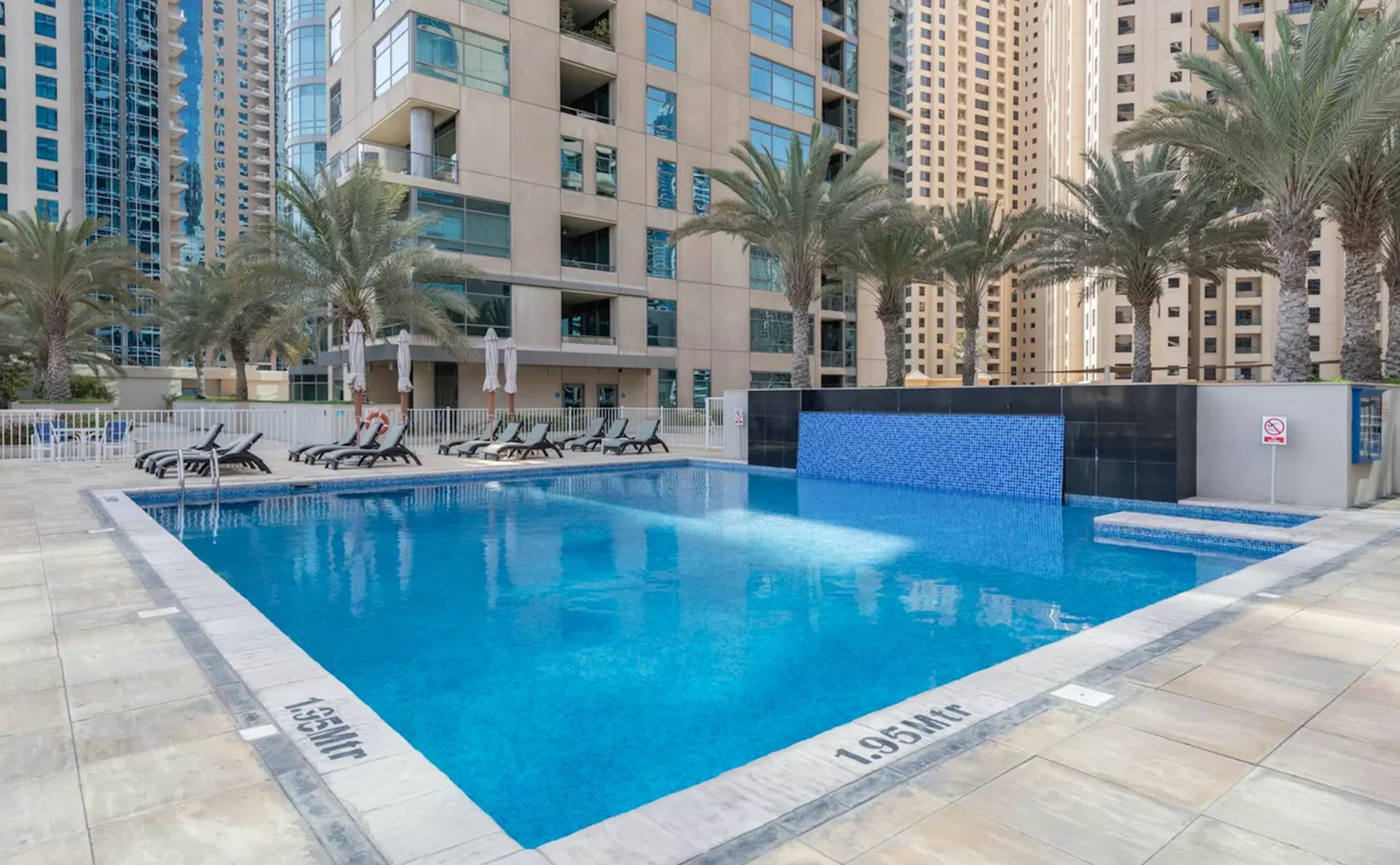 Located in Dubai's Marina, this walk-up apartment provides a practical stay for those travelling for business or pleasure. The interiors are bright, and well-equipped for a short city break, and the dining table can easily double as a laptop-friendly setup for remote working. The home's standout feature is the private balcony with seating for two – ideal for cool drinks at sunset. You'll also have access to a host of shared amenities here, including a gym, pool and barbecue area, as well as squash courts and a play area for little ones. When you’re ready to explore, take a stroll down to the JBR beach, just a six-minute walk away or head to some of the designer shops, gourmet restaurants and trendy bars nearby.