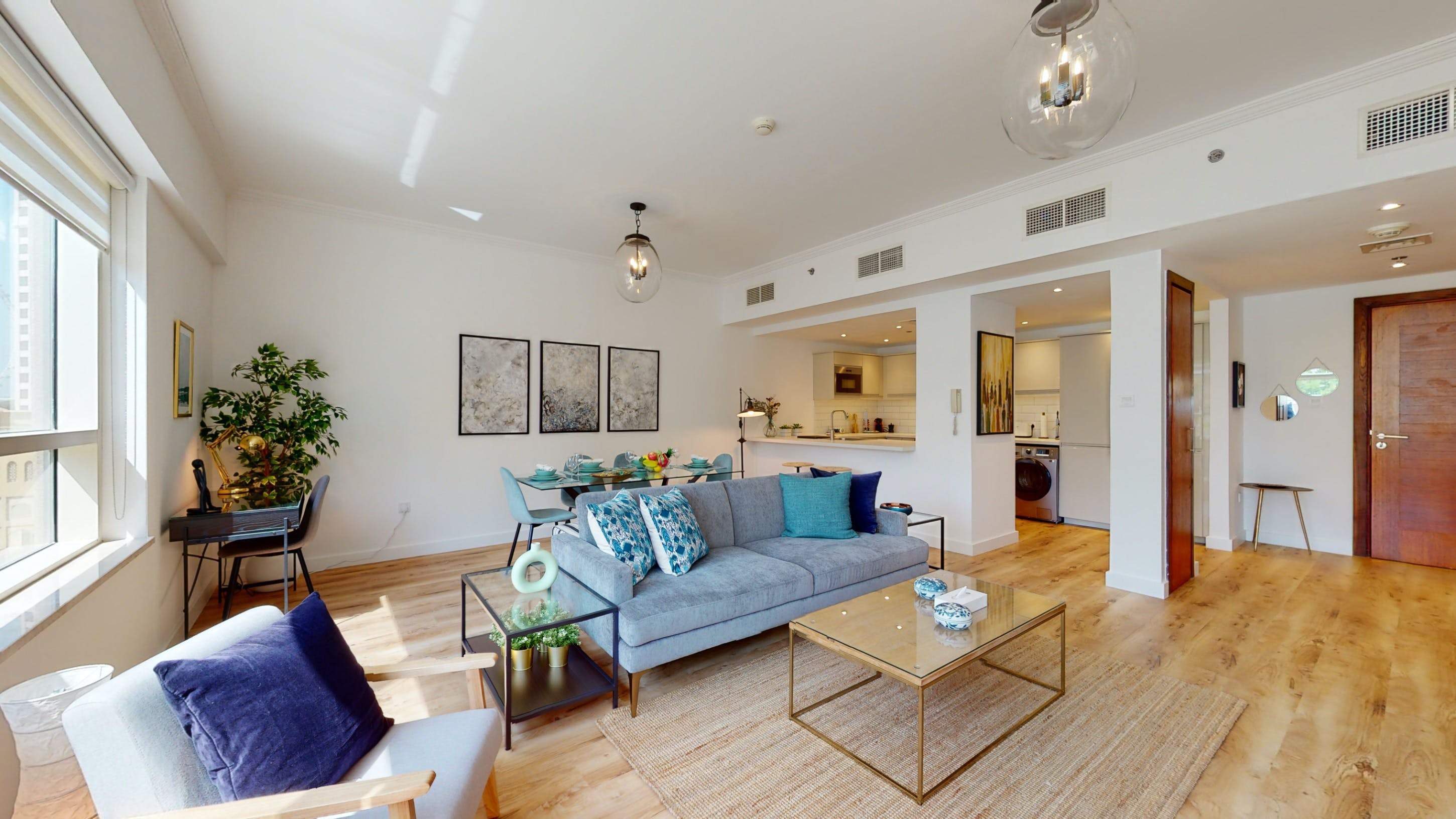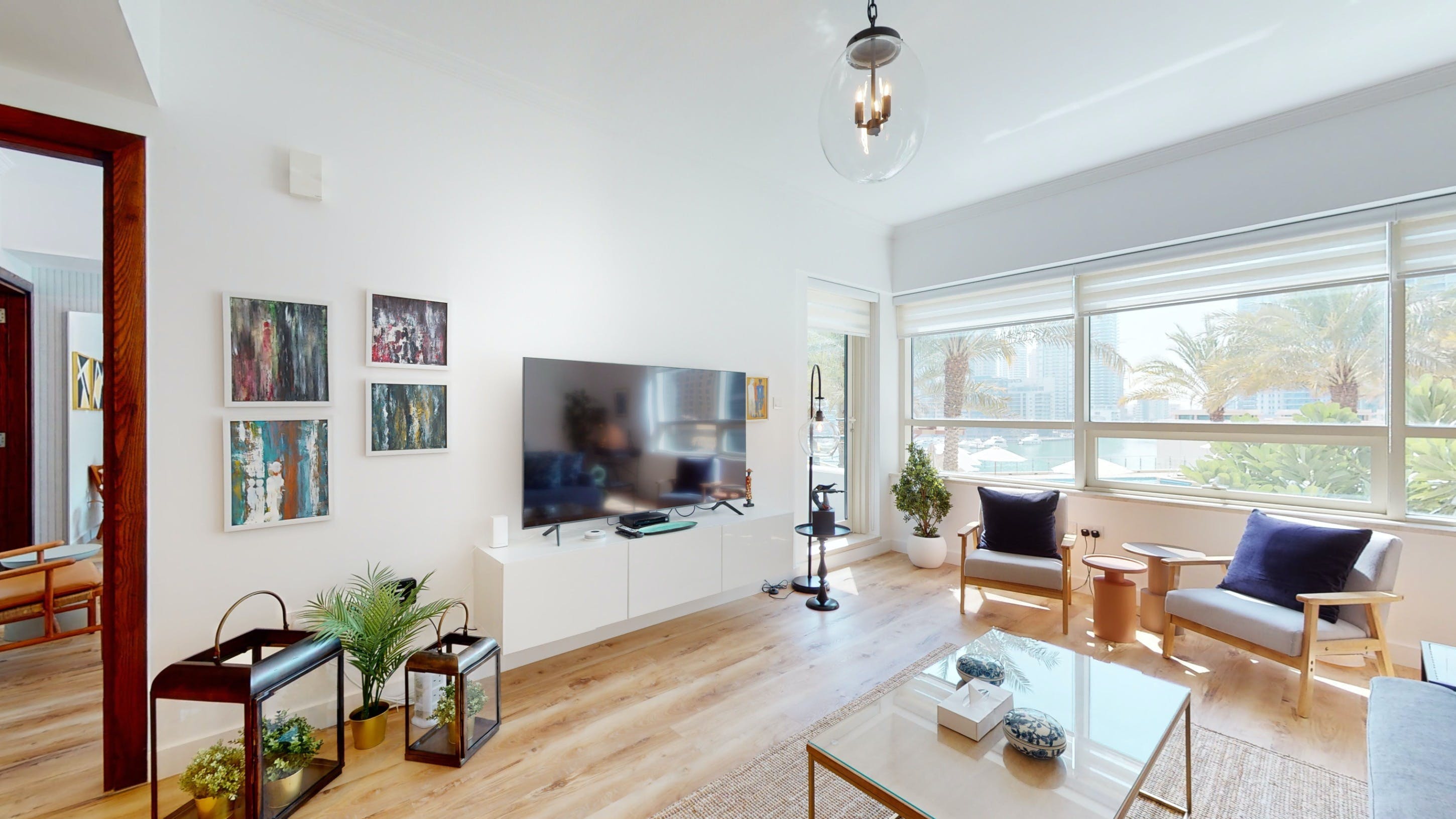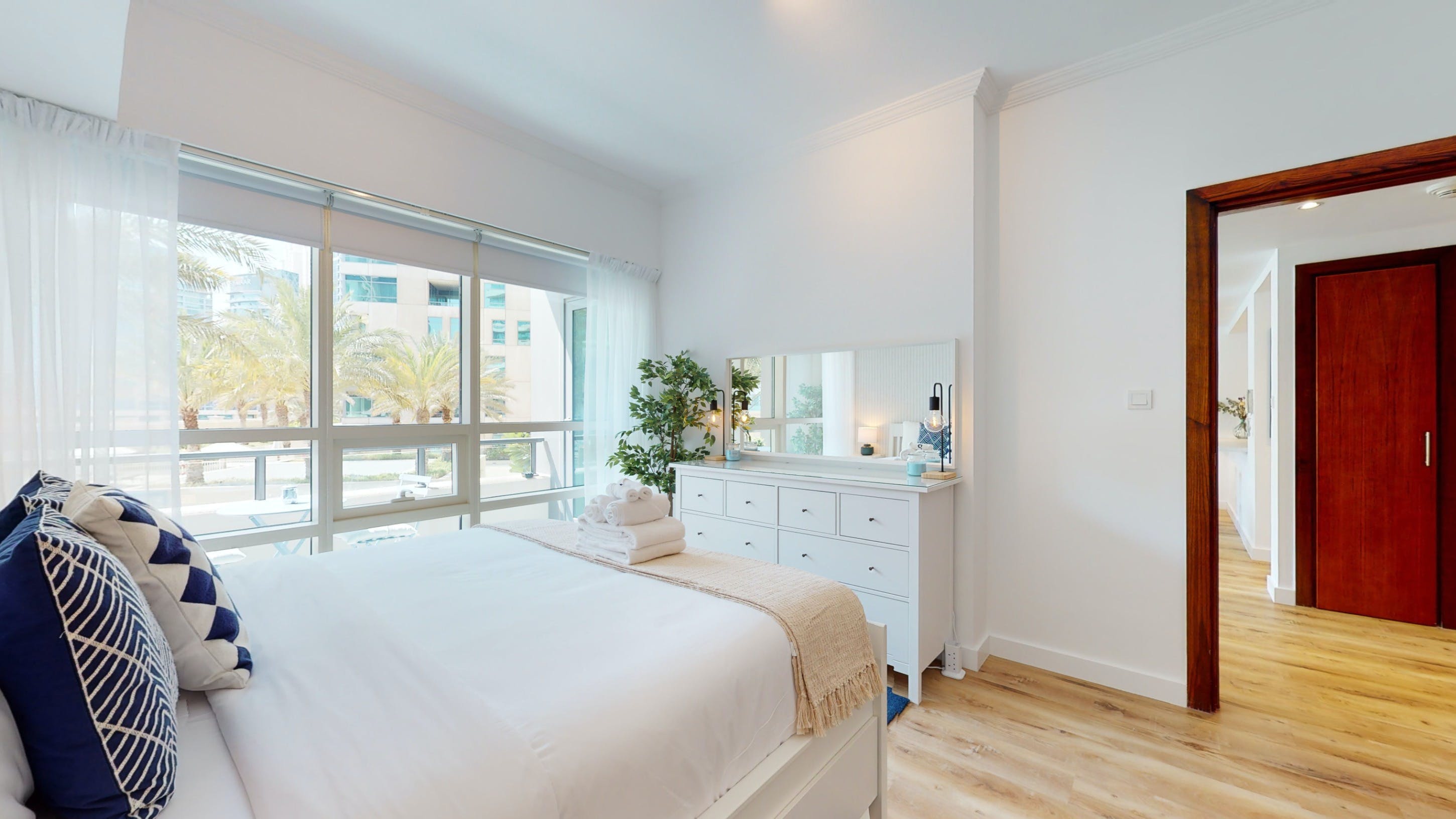 Located in Dubai's Marina, this walk-up apartment provides a practical stay for those travelling for business or pleasure. The interiors are bright, and well-equipped for a short city break, and the dining table can easily double as a laptop-friendly setup for remote working. The home's standout feature is the private balcony with seating for two – ideal for cool drinks at sunset. You'll also have access to a host of shared amenities here, including a gym, pool and barbecue area, as well as squash courts and a play area for little ones. When you’re ready to explore, take a stroll down to the JBR beach, just a six-minute walk away or head to some of the designer shops, gourmet restaurants and trendy bars nearby.