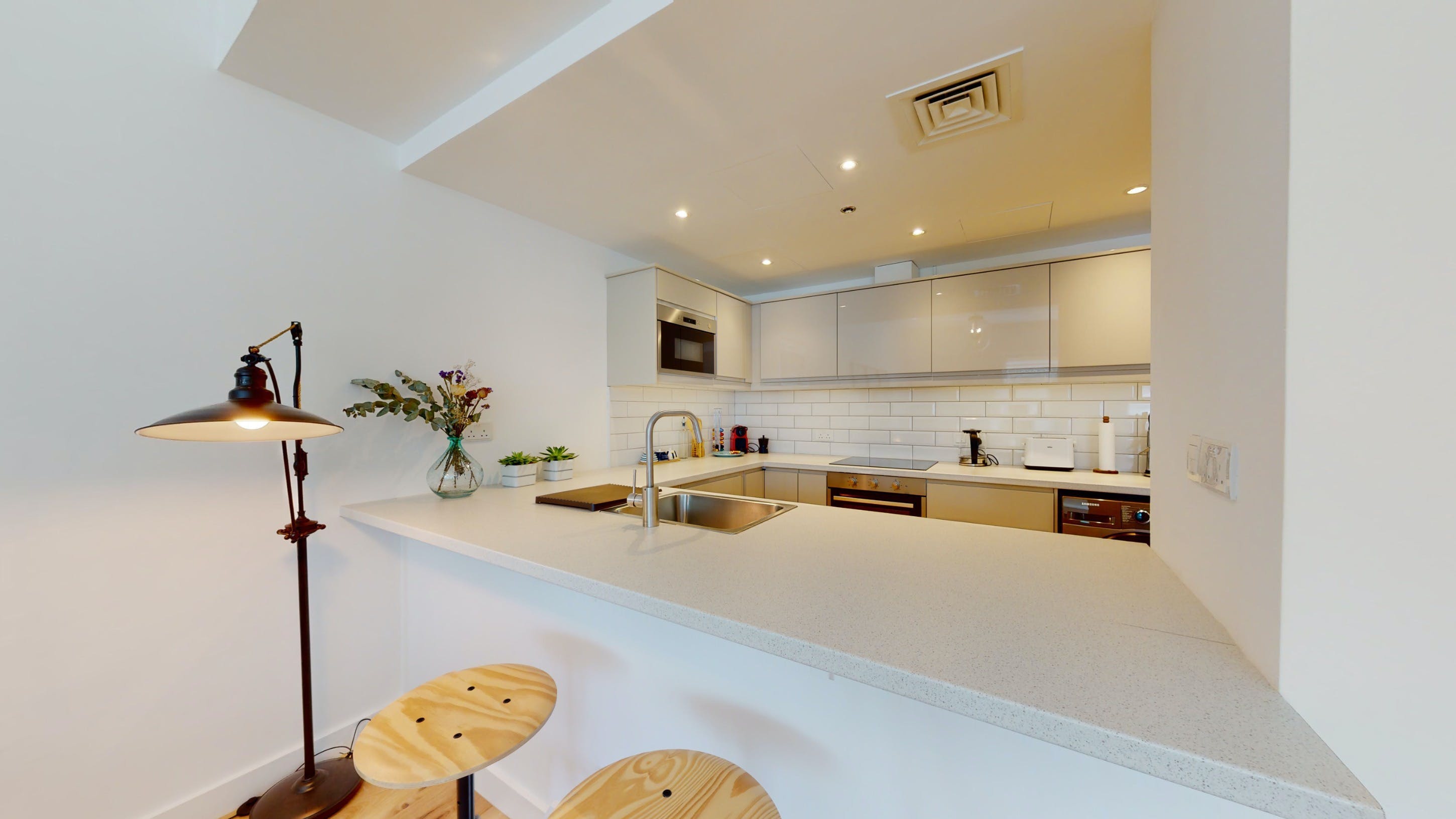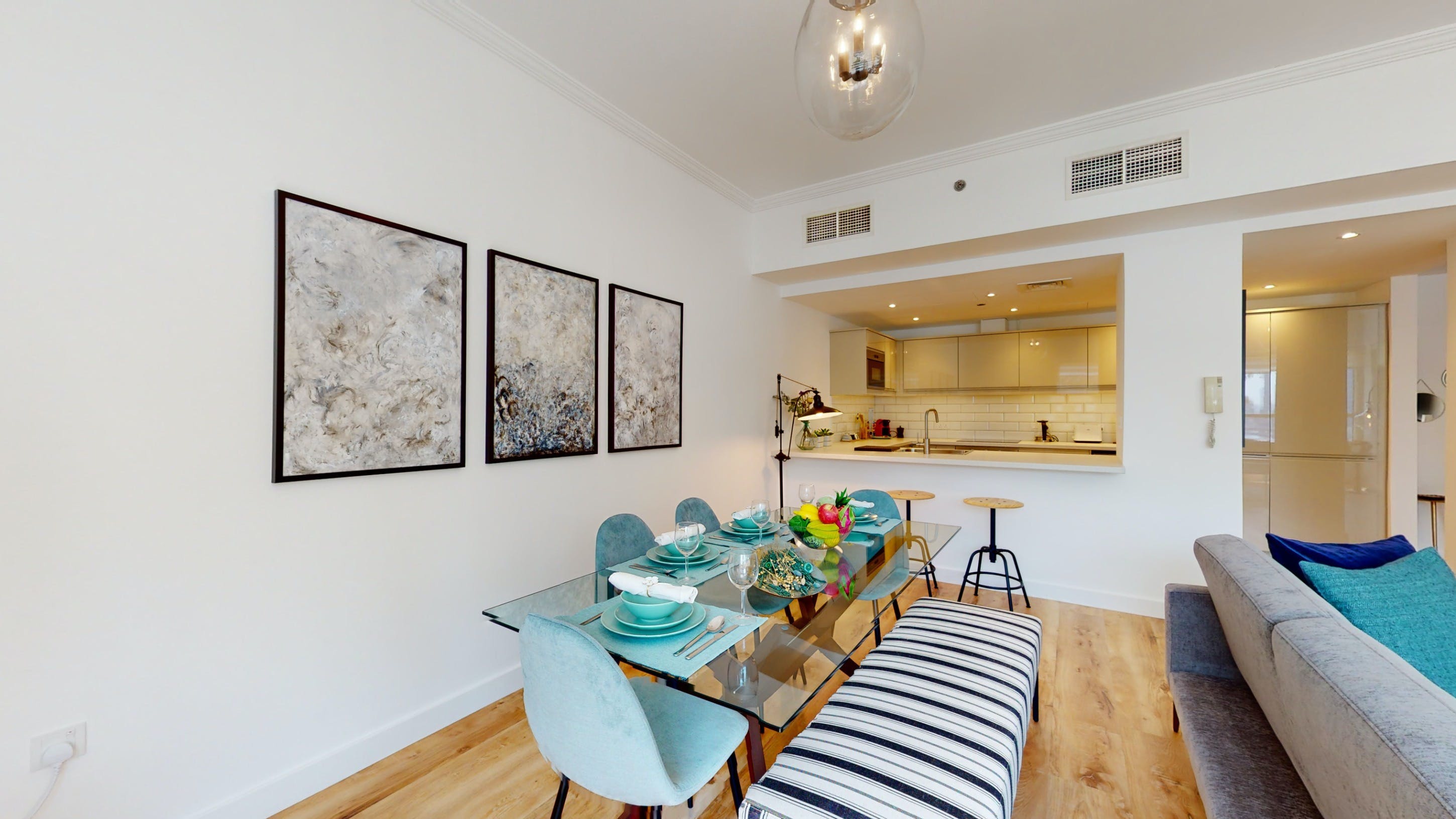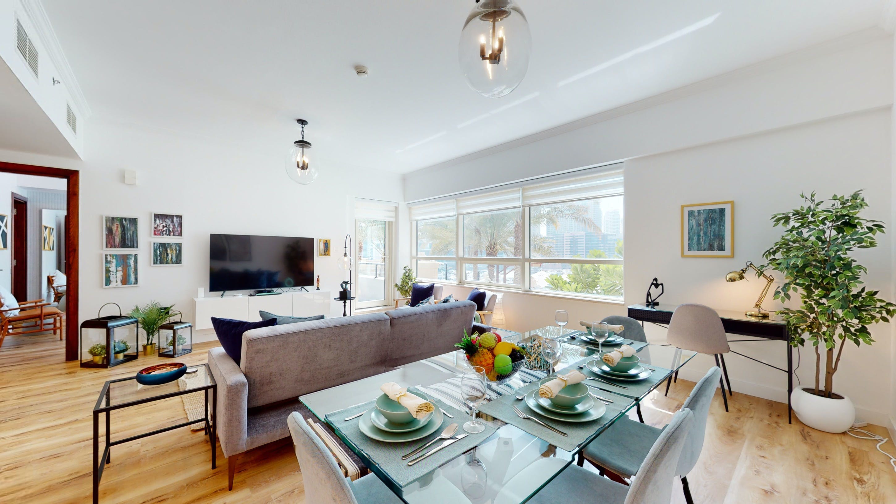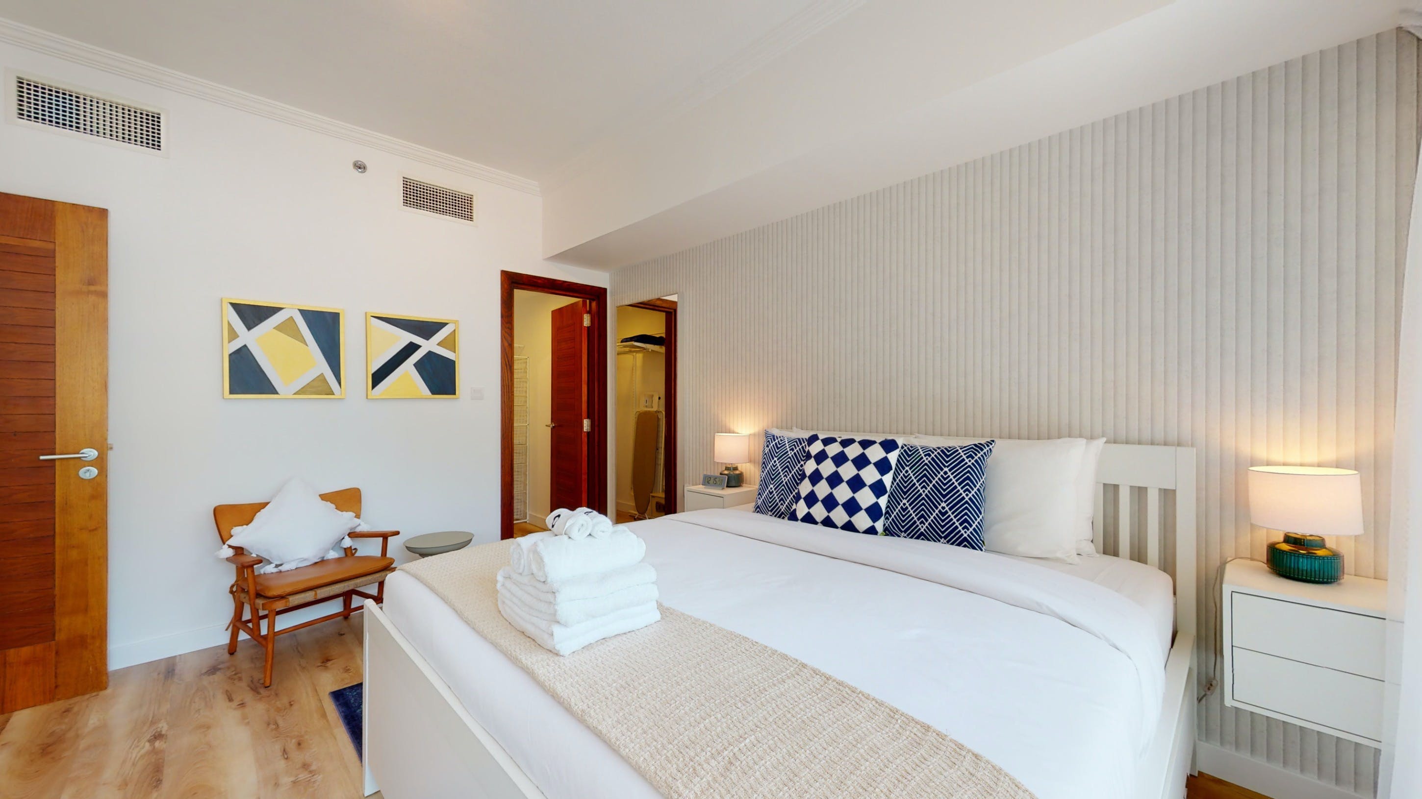 Located in Dubai's Marina, this walk-up apartment provides a practical stay for those travelling for business or pleasure. The interiors are bright, and well-equipped for a short city break, and the dining table can easily double as a laptop-friendly setup for remote working. The home's standout feature is the private balcony with seating for two – ideal for cool drinks at sunset. You'll also have access to a host of shared amenities here, including a gym, pool and barbecue area, as well as squash courts and a play area for little ones. When you’re ready to explore, take a stroll down to the JBR beach, just a six-minute walk away or head to some of the designer shops, gourmet restaurants and trendy bars nearby.