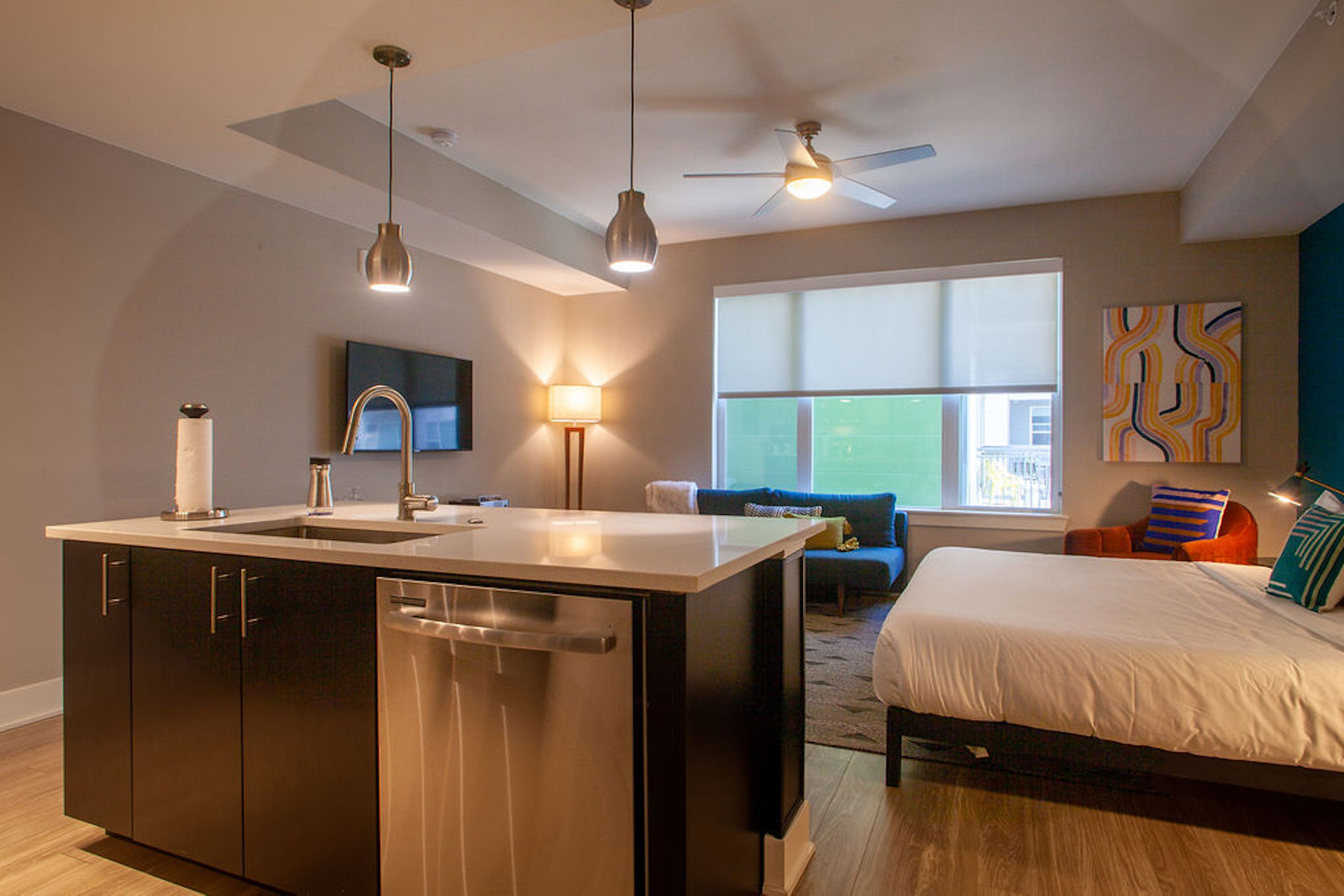 Convenient and chic despite its small size, this studio apartment in Denver’s trendy LoDo neighbourhood is an easy way to life as a local. The compact set-up is ideal for a couple or solo traveler staying in Denver for business or fun. It's not a large space, but you'll still find colourful details and a smart layout, including a fully-equipped kitchen with its own barstool seating area. Outside of the studio, the building has several shared amenities like a swimming pool, gym and a business suite to make your day-to-day simple. Down at street level, there are a plethora of nearby eateries, live music venues, and the lovely South Platte River. Come prepared with your walking shoes because sites like the Museum of Contemporary Art Denver and Confluence Park are also right in the neighbourhood.