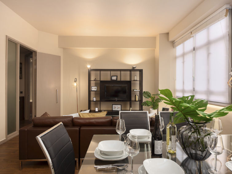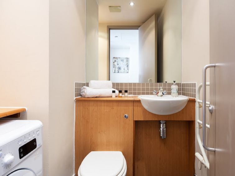 "Lawrence House", 2-room apartment 40 m2. Modern and stylish furnishings: open living/dining room with dining table and TV (flat screen). 1 double bedroom with 1 double bed and bath/shower/WC. Open kitchen (4 hot plates, oven, dishwasher, toaster, kettle, freezer, combination microwave). Heating. Facilities: washing machine, dryer, baby cot for up to 2 year olds, hair dryer. Internet (WiFi, free). Please note: suitable for families. TV only EN. Smoke alarm, fire extinguisher.