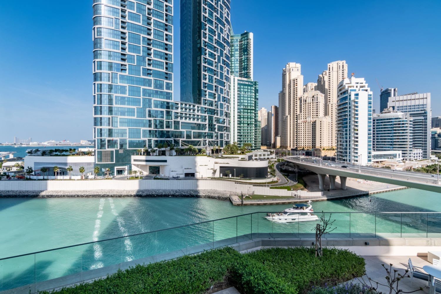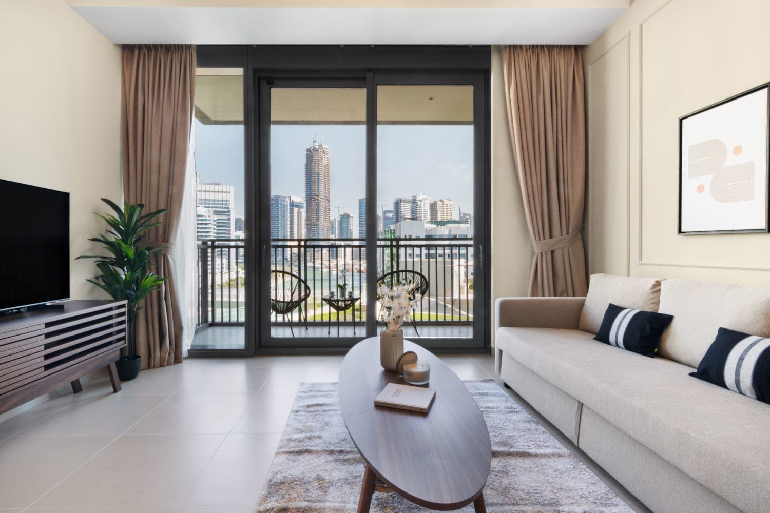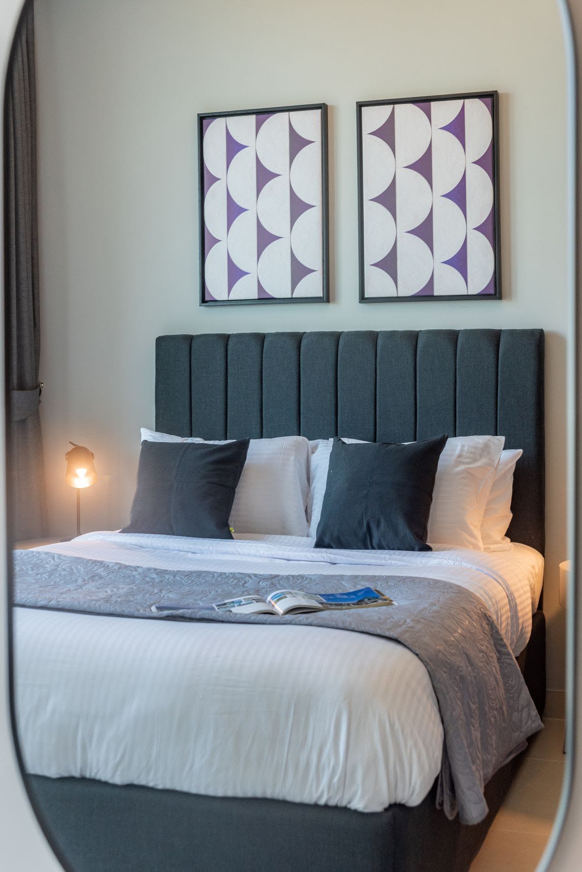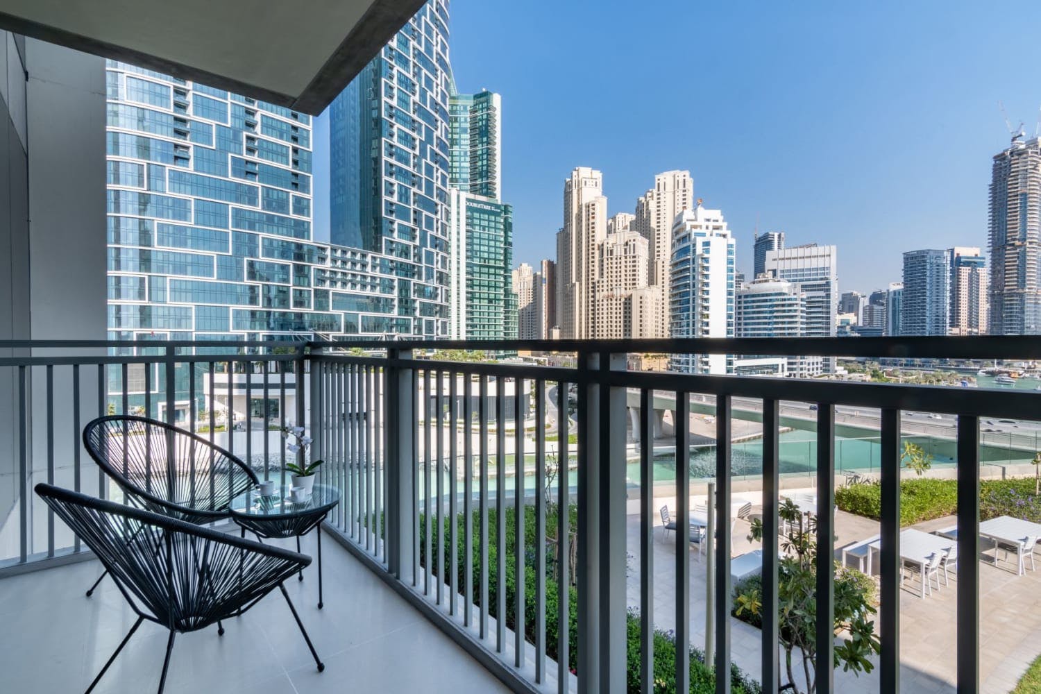 This minimalist yet chic apartment is located above Dubai’s beautiful marina and includes scenic views of the carved waterways and their surrounding epic architecture. The apartment itself features an elegant, open-plan design with unique touches that add a sense of character, such as the mid-century style furniture, plush rugs, and geometric artwork. This is the perfect base for anyone looking to explore all that this city’s astounding built environment has to offer, whether you’re here for the world-class golf, the Michelin rated restaurants, white sand beaches, or dazzling nightlife. Arriving home after a day of exploring Dubai’s luxurious offerings, you’ll find the ample bedroom with king size bed, en-suite, and sweeping views provides all the comfort you need for a restful sleep. Come morning, take your coffee out to the private balcony before heading to the building's shared gym for a workout, or to the pool for a refreshing swim to start your day.