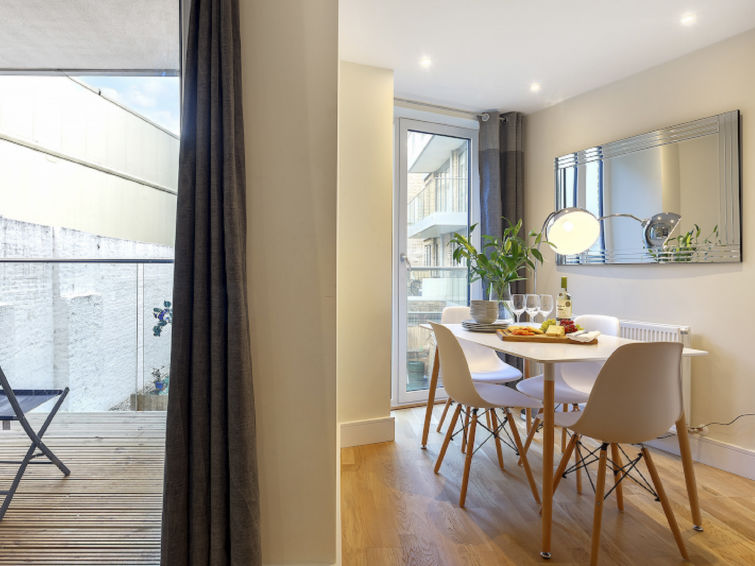 "Indescon Square, Canary Wharf", 3-room apartment 68 m2. Modern and tasteful furnishings: living/dining room with dining table and TV (flat screen). Exit to the balcony. 2 double bedrooms, each room with 1 double bed and bath/shower/WC. Open kitchen (4 hot plates, oven, dishwasher, toaster, kettle, freezer, combination microwave). Heating. Large balcony. Balcony furniture. View of the garden. Facilities: washing machine, dryer, baby cot for up to 2 year olds (extra), hair dryer. Internet (WiFi, free). Please note: suitable for families. Non-smoking house. TV only EN. Smoke alarm, fire extinguisher.
